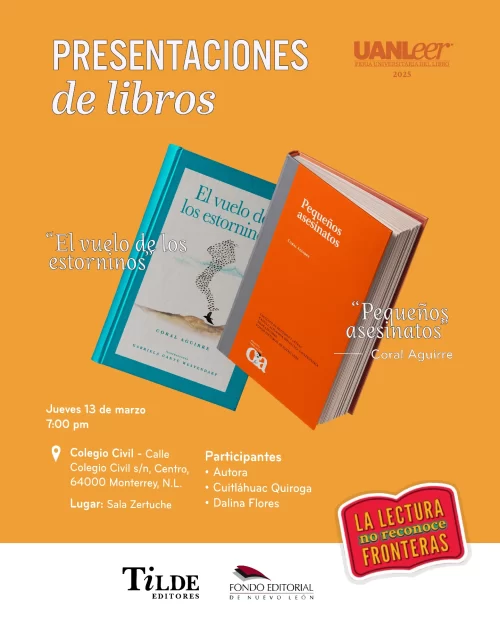 La Feria Universitaria del Libro UANLeer 2025 fue el escenario para la presentación de Pequeños asesinatos, título con el que se inaugura la Biblioteca Coral Aguirre, editada por el Fondo Editorial, la Facultad de Filosofía y Letras, la Capilla Alfonsina Biblioteca Universitaria y Tilde Editores.